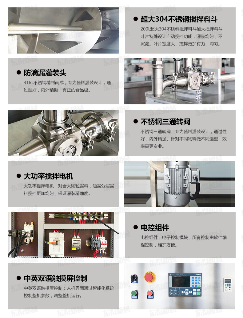 4.大功率攪拌電機(jī):對含大顆粒醬料,油醬分層醬料攪拌更加均勻,保證灌裝精確度
