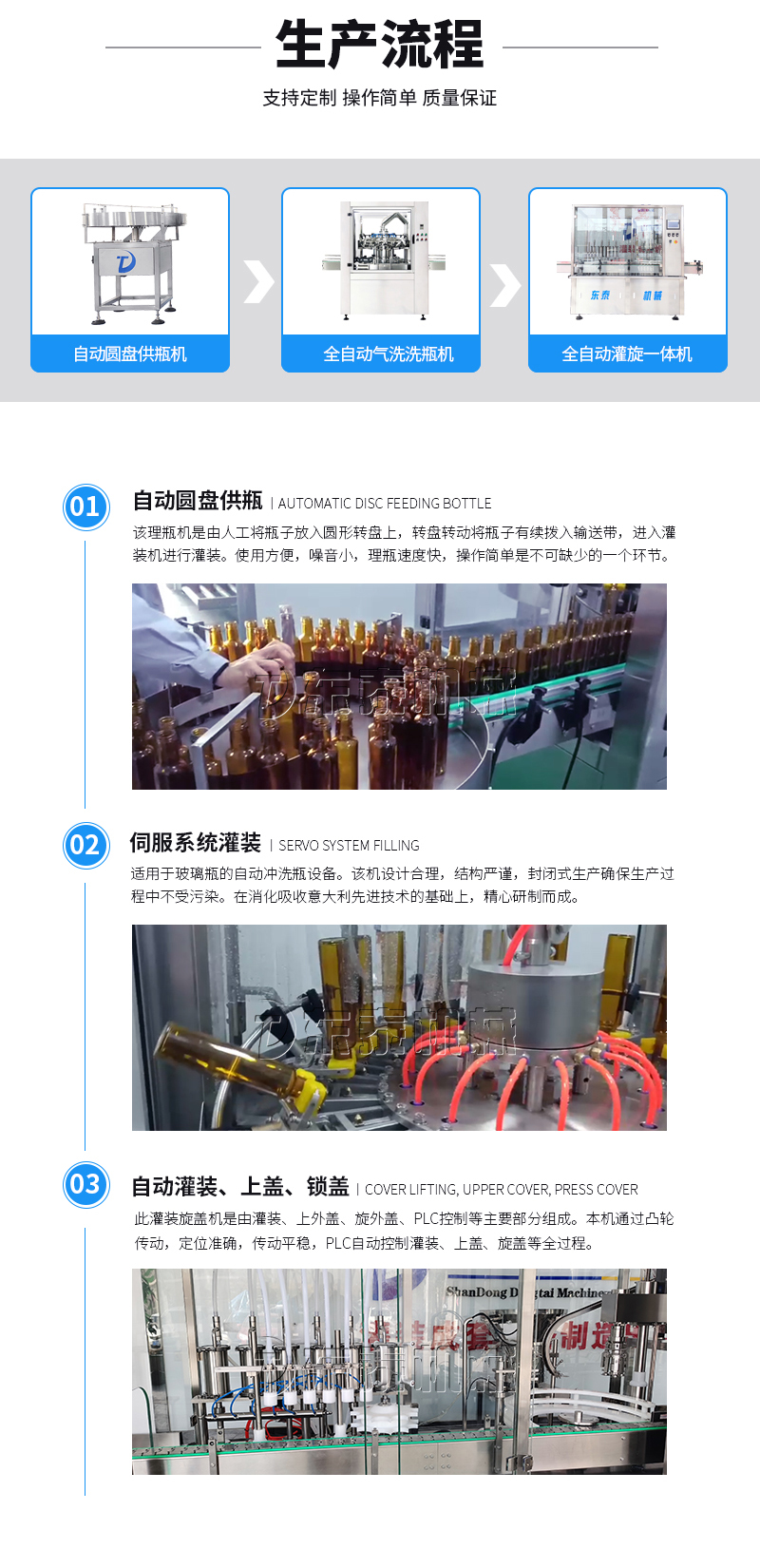 本灌裝流水線設(shè)備具有穩(wěn)定可靠、自動化水平高,相比同類產(chǎn)品有著更長的使用年限,維護簡單,整線中各設(shè)備的協(xié)調(diào)性、連貫性強,整線設(shè)計合理等特點。灌裝設(shè)備采用獨家專利系統(tǒng)結(jié)構(gòu),為當(dāng)今行業(yè)內(nèi)水平,整線滿足量產(chǎn)化、集成化生產(chǎn)的需要。