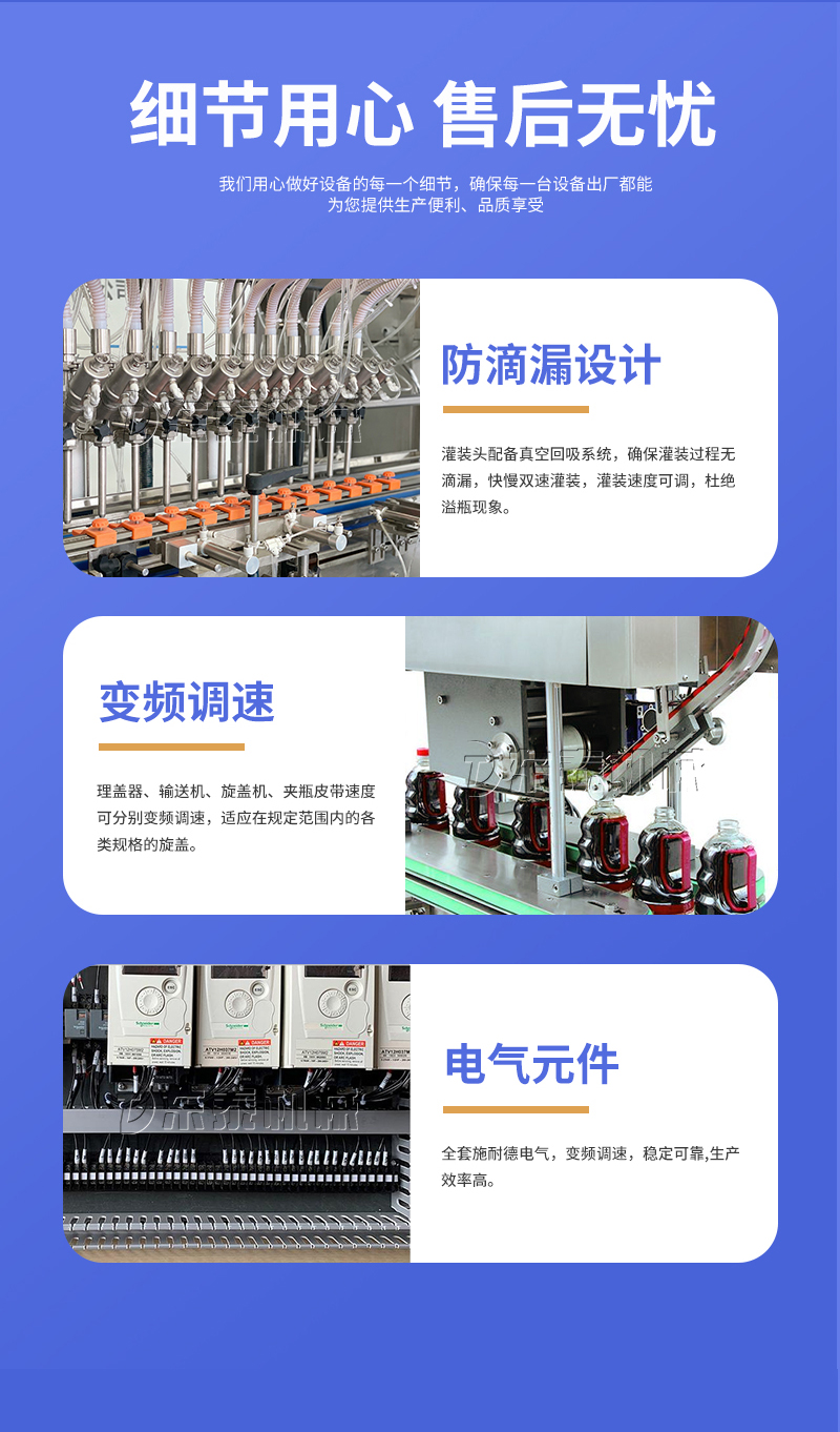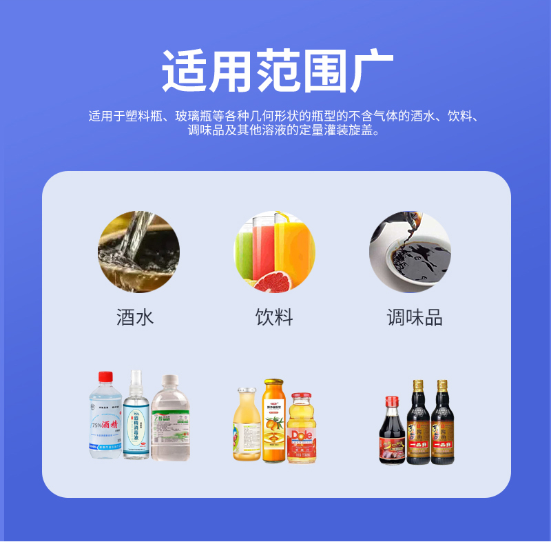 本機適用于多種材質(zhì),多種幾何形狀的容器,如塑料片、玻璃瓶、金屬瓶等;在需要更換瓶或蓋的時候,只要調(diào)整部分零件的位置即可,無需更換任何配件;在旋蓋過程中可以做到無瓶不下蓋。理蓋器、輸送機、旋蓋機、夾瓶皮帶速度可分別變頻調(diào)速,適應(yīng)在規(guī)定范圍內(nèi)的各類規(guī)格的旋蓋。(附:特殊規(guī)格定制即可)