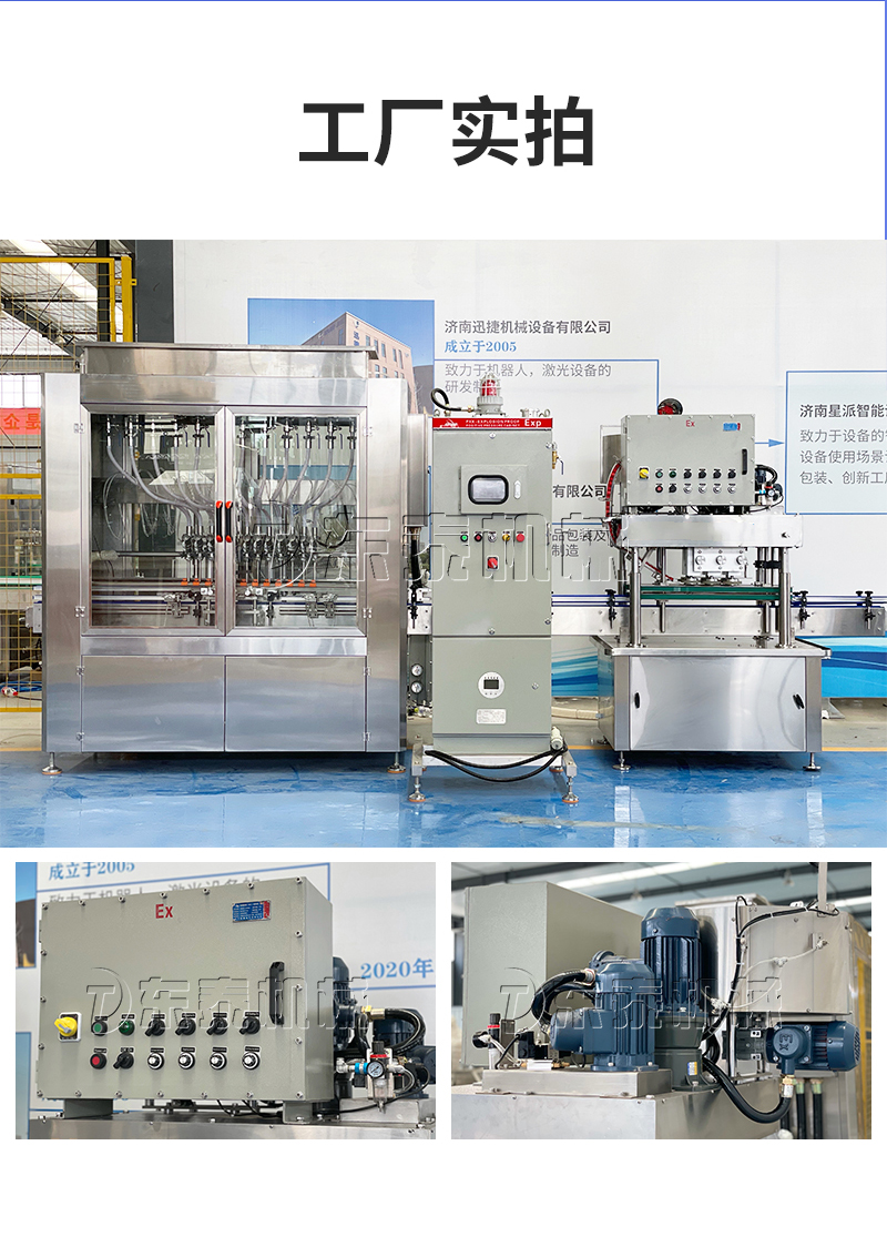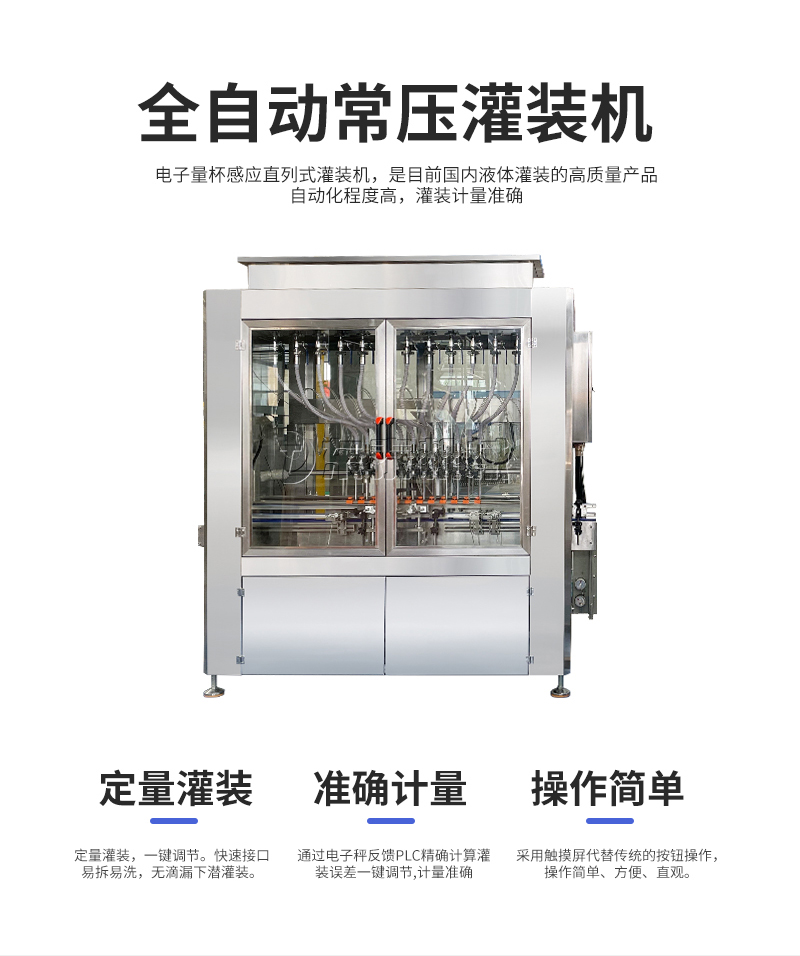 電子量杯感應(yīng)直列式灌裝機,是目前國內(nèi)液體灌裝的高端產(chǎn)品,自動化程度高,灌裝計量精確,適用于塑料瓶、玻璃瓶等各種幾何形狀的瓶型的不含氣體的酒水、飲料、調(diào)味品及其他溶液的定量灌裝。機器采用觸摸屏代替?zhèn)鹘y(tǒng)的按鈕操作,操作簡單、方便、直觀。科技含量高。機器灌裝計量可通過觸摸屏對灌裝時間的調(diào)整實現(xiàn)不同計量灌裝,方便操作者使用。