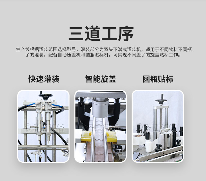 產(chǎn)品說明:生產(chǎn)線根據(jù)灌裝范圍選擇型號,灌裝部分為雙頭下潛式灌裝機,適用于不同物料不同瓶子的灌裝,配備自動壓蓋機和圓瓶貼標(biāo)機,可實現(xiàn)不同蓋子的旋蓋貼標(biāo)工作。