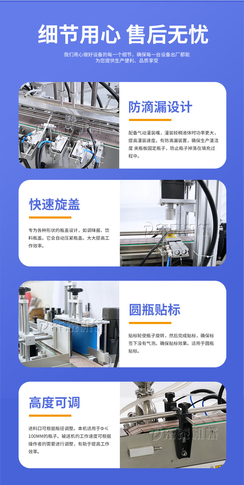產(chǎn)品說明:生產(chǎn)線根據(jù)灌裝范圍選擇型號,灌裝部分為雙頭下潛式灌裝機,適用于不同物料不同瓶子的灌裝,配備自動壓蓋機和圓瓶貼標(biāo)機,可實現(xiàn)不同蓋子的旋蓋貼標(biāo)工作。 本設(shè)備主要適用于食品、日;