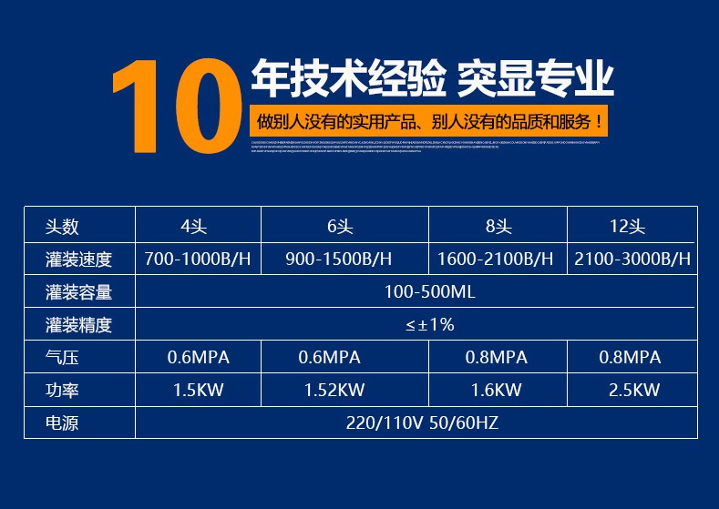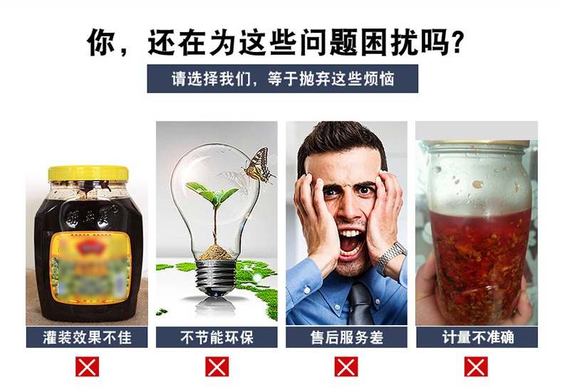 該生產線適合中小口徑三旋、四旋玻璃瓶調味醬的分裝,適合醬料、含顆粒黏稠物料的灌裝,物料接觸部分均采用316不銹鋼,整機304不銹鋼,符合食品衛(wèi)生標準。該機設計合理,機型小巧,立式結構,節(jié)省場地,操作方便。啟動部分均采用德國FESTO和臺灣AirTack的氣動元件。灌裝閥有氣動閥控制,灌裝精度更高,灌裝量和灌裝速度均可任意調整,灌裝悶頭采用防拉絲及升降灌裝裝置。