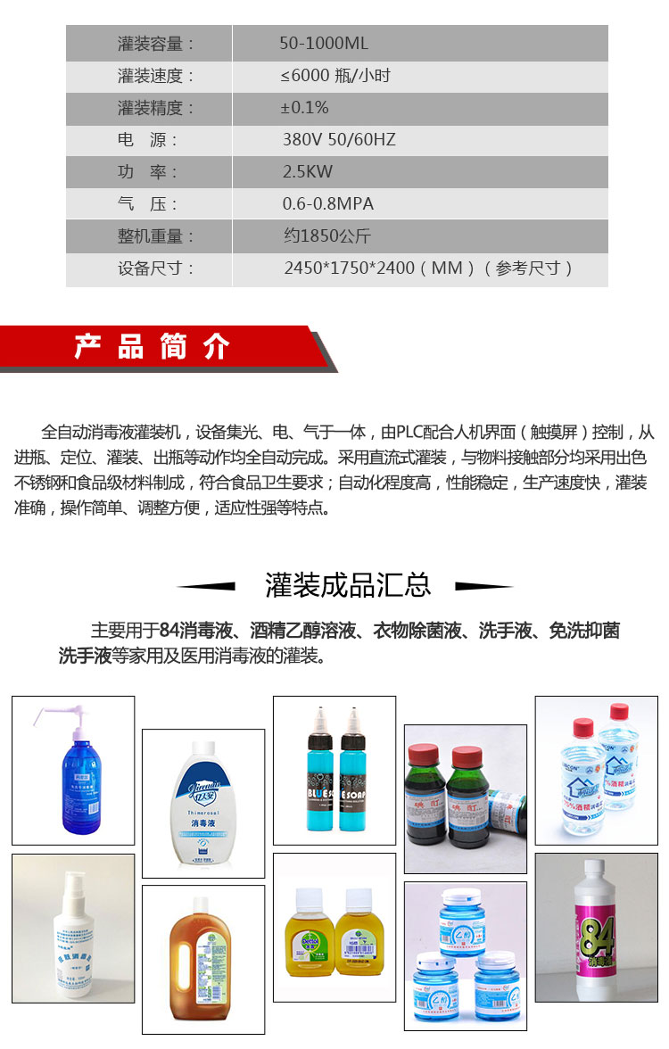 該機(jī)是我司很新研制的消毒液灌裝機(jī),設(shè)備集光、電、氣于一體,由PLC配合人機(jī)界面(觸摸屏)控制,從進(jìn)瓶、定位、灌裝、出瓶等動作均全自動完成。采用直流式灌裝,與物料接觸部分均采用出色不銹鋼和食品級材料制成,符合食品衛(wèi)生要求;自動化程度高,性能穩(wěn)定,生產(chǎn)速度快,灌裝準(zhǔn)確,操作簡單、調(diào)整方便,適應(yīng)性強(qiáng)等特點。